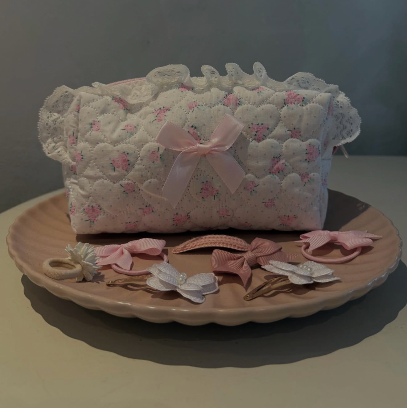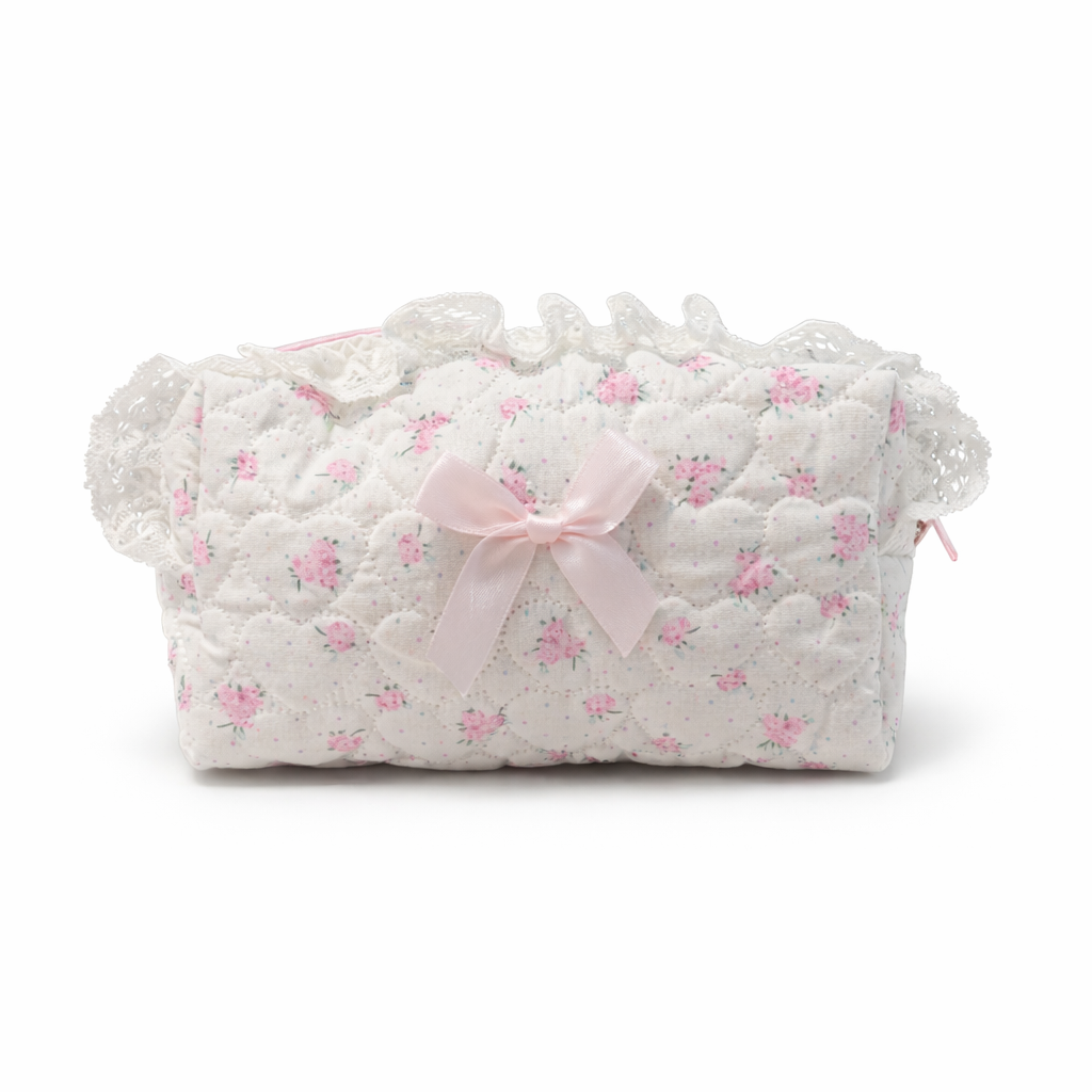 Hoe schattig is dit tasje met rozenmotief? Dit lieve accessoire is perfect om kleine spulletjes netjes in op te bergen, zoals haarspeldjes, elastiekjes of kleine essentials voor onderweg. De zachte stof, het romantische bloemenprintje en het strikdetail geven het tasje een extra lieve, luxe uitstraling.